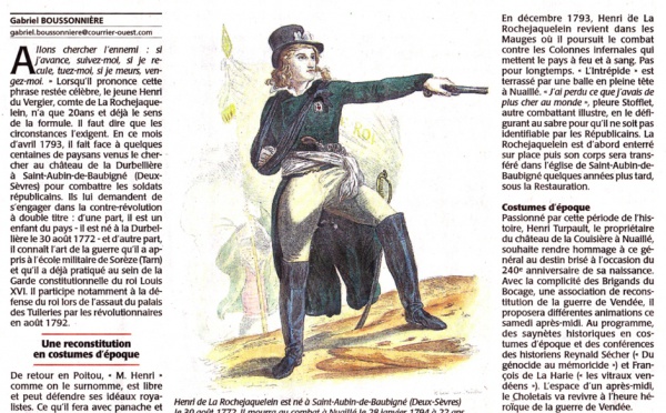 Revue de presse pour la manifestation en l'honneur d'Henri de La Rochajaquelein : le Courrier de l'ouest